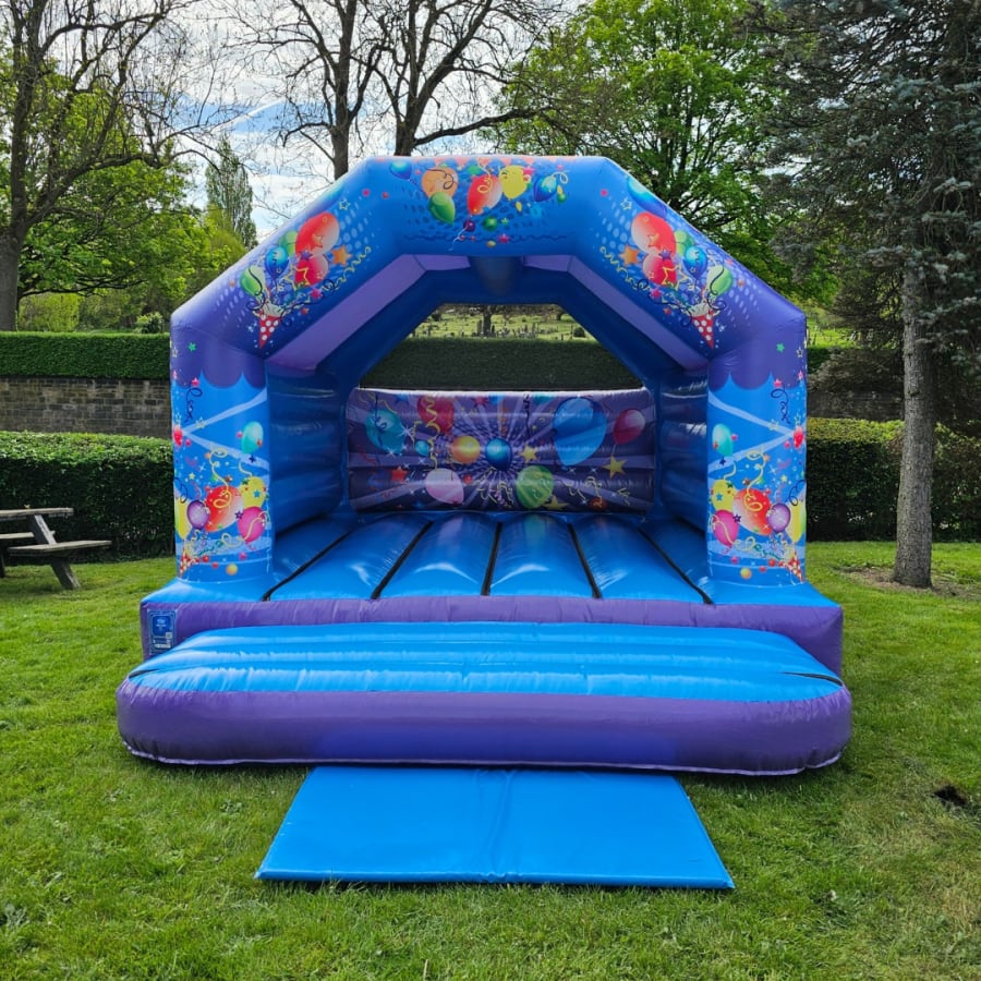 The Party Bouncer Bouncy Castle features a striking blue and purple design with balloon graphics that grab attention instantly. Its 12 x 16ft dimensions make it practical for most outdoor spaces, while the bright colours create a playful atmosphere. Combining the castle with our complete party package adds even more fun and variety to any event.