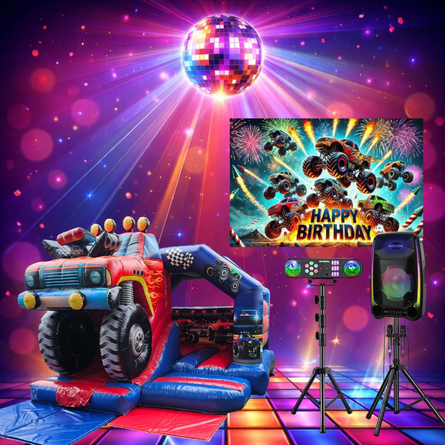 Our 3D Monster Truck Indoor Party Package with Slide is an exciting all in one setup, perfect for action-packed birthday parties and vehicle themed celebrations. This package includes a 3D monster truck–themed bouncy castle with slide, a disco light stand, a monster truck–themed Happy Birthday backdrop, and a powerful Bluetooth speaker (microphone available on request)